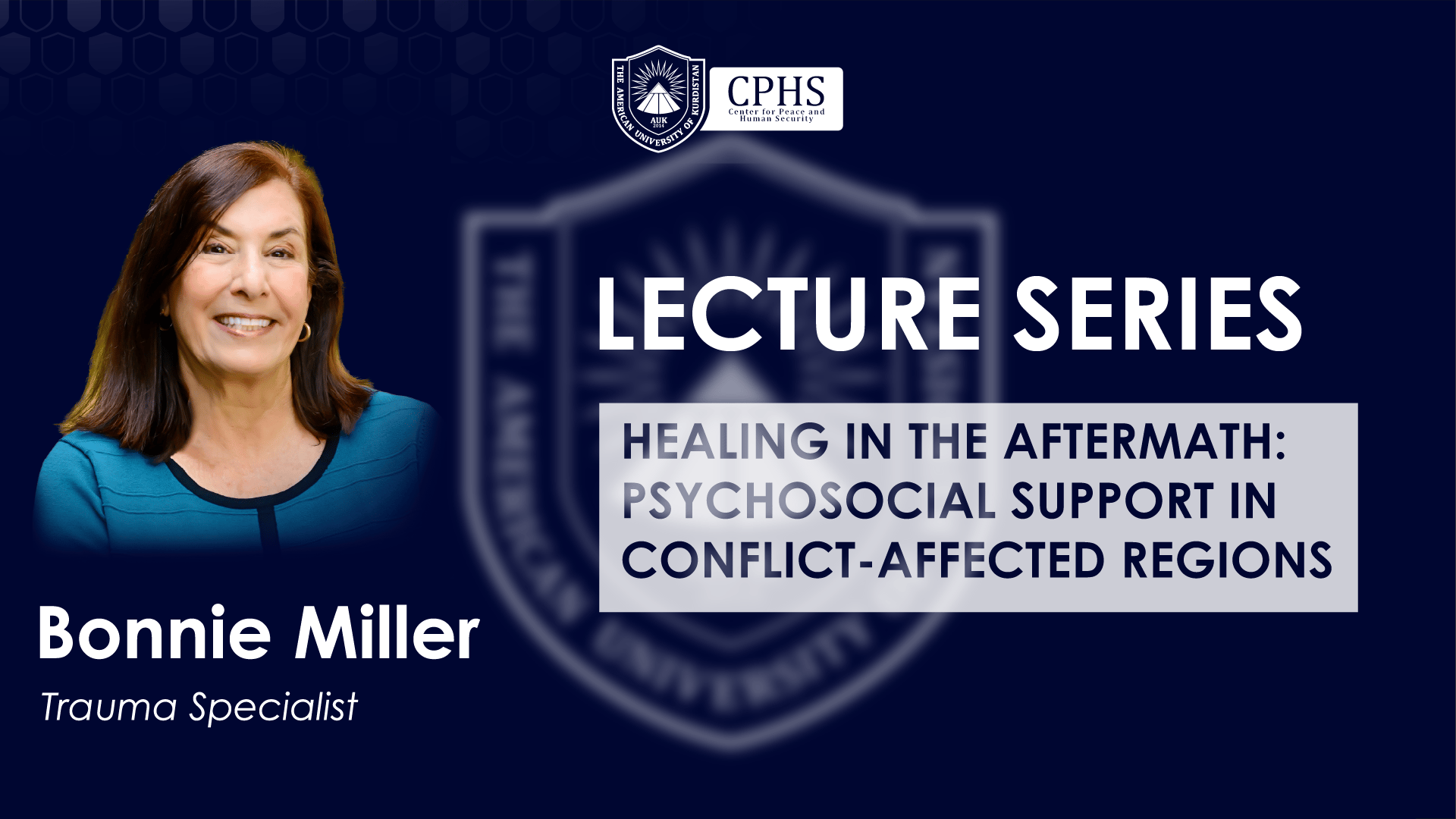 On September 16, 2025, the Center for Peace and Human Security (CPHS) at AUK opened its Fall Lecture Series with a talk by Bonnie Miller, former Professor of Social Work and Psychology and Director of Action for Community Empowerment in Syria (ACES). Her lecture, “Healing in the Aftermath,” explored how trauma impacts communities in conflict settings and the value of culturally sensitive, trauma-informed approaches such as stress management, social-emotional learning, and positive parenting. More than 80 students and staff attended the session, which concluded with a Q&A on gender-based violence and post-conflict recovery.